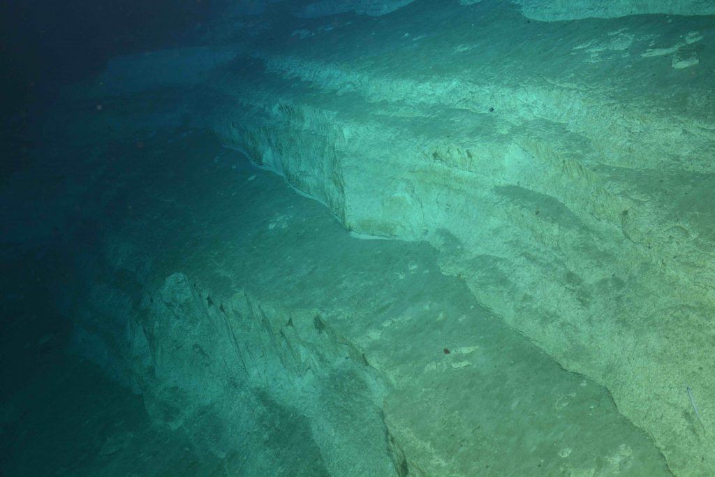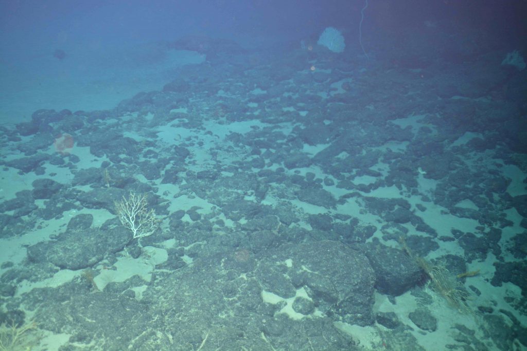 In a similar fashion to what was previously described further east, we expected to find on the plateau a carbonate platform. These structures are believed to be evidence of a past emergence. However, from a depth of 1800 metres, the landscape change dramatically, becoming very flat, covered in a dark manganese crust. We find this sort of lithology to the top.